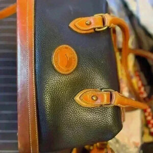 Dooney & Bourke 1990’s all weather collection. Doctor Satchel in Blue & cognac pebbles leather. Working lock and key. 11”x7”x5” All brass fittings. Straps and handles removable. Strap is adjustable. 5 brass feet on the bottom. Opens to suede interiors with minimal signs of wear. Slip pockets secured by leather tongue.