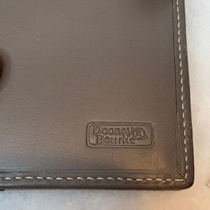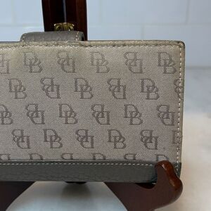 This vintage designer Dooney & Bourke wallet checkbook features a prominent monogrammed canvas in a light gray shade, adorned with the repeating "DB" logo. The wallet is accented with a contrasting, genuine, leather trim and a snap closure tab in a darker, gray color. The design incorporates the signature Dooney & Bourke aesthetic, known for its timeless appeal.