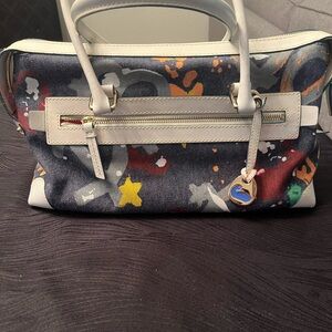 Dooney & Bourke White and Blue denim purse with locking front pockets.