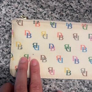 Chic and stylish, this Dooney & Bourke clutch features a vibrant multicolor logo design on a cream background. Perfect for adding a pop of color to any outfit.