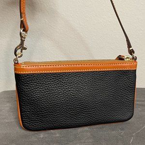 Small black pebbled leather zipper clutch with strap, tan leather details, card slots inside.