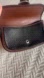 Black pebbled leather and smooth brown leather accented wristlet from Dooney & Bourke. Removable wristlet strap and silvertone hardware. Good used condition with external scuffing on leather and some flaking of red lining.