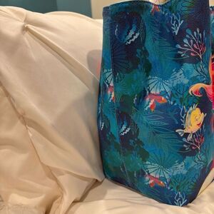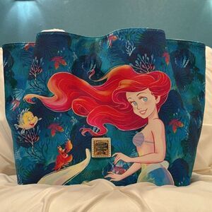 Only taken out of packing for pictures! Gorgeous The Little Mermaid Dooney & Bourke tote bag! Features Ariel, Sebastian and Flounder on an aquatic backdrop and signature Dooney & Bourke craftsmanship with vibrant eye catching colors!. With several pockets, a credit card slot and an inside key hook, this carry-all keeps all your essentials beautifully organized.