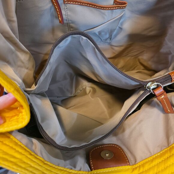 This tote bag embodies a radiant blend of functionality and style, featuring durable nylon paired with leather accents. The interior is thoughtfully designed with multiple compartments for organized storage, making it a versatile accessory for daily errands or leisurely outings. Its sunny hue and quality craftsmanship exude timeless charm.