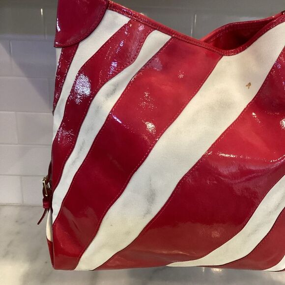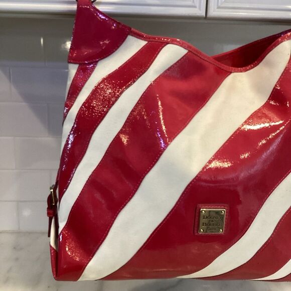 Authentic Dooney & Bourke Zebra Print Large Leather Shoulder Hobo Bag, featuring a distinctive hot pink and white striped pattern. This style is part of Dooney & Bourke's Zebra Collection, known for its bold prints and use of Vacchetta leather. While not an official collection name, this style is often referred to by consumers as a "Candy Stripe" bag due to its resemblance to classic candy cane or striped candy designs. It's a large shoulder bag or hobo-style bag, known for its spacious interior and functional features like magnetic snap closure, inside pockets, and a key clip. This particular design is well-suited for adding a vibrant touch to outfits. Photos are the best description of this preloved D&B beauty!! Please ask questions and make an offer!!