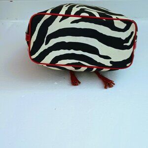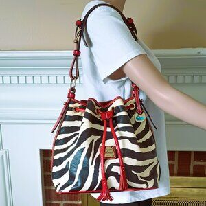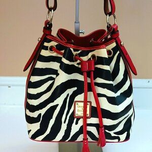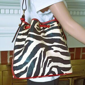 Dooney & Bourke Zebra Stripe Drawstring Bag Black & Off White Leather Bucket Bag