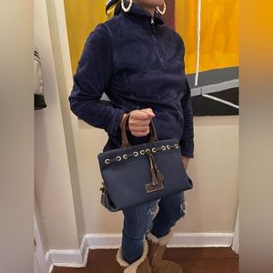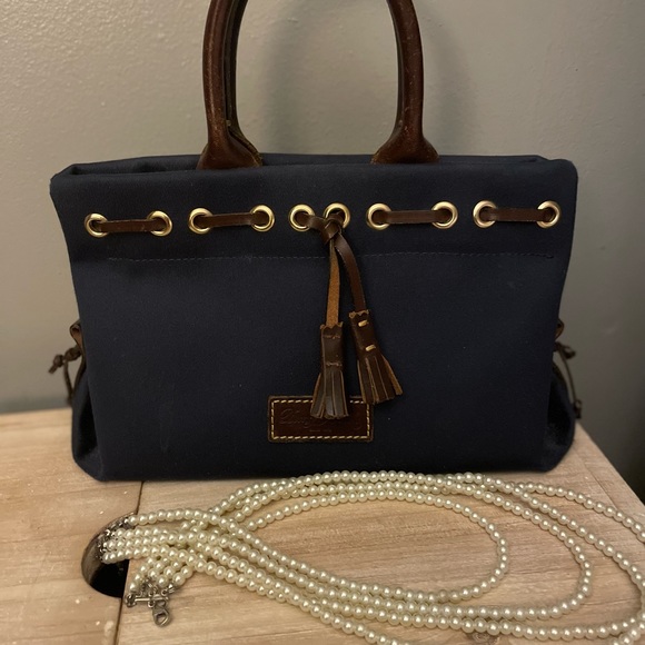 Beautiful bag beautiful color dark blue excellent condition that cloth material just missing the strap but you can add one great with Jean 😍