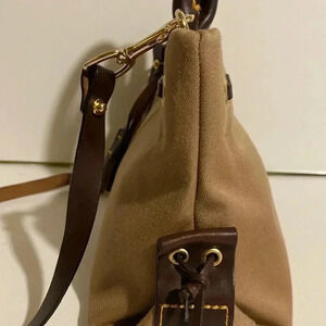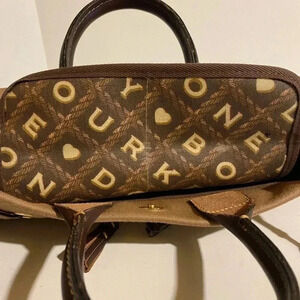 Authentic dooney & Bourke beige/ brown canvas/ leather satchel handbag with gold tone hardware main compartment 4 open pockets at interior wall leather strap & trim logo at front hight 7” width 12” depth 4.25” Strap drop 4.5” shoulder strap 19” Bag dimensions are based on approximately measurements Before placing an order please take a moment to view all photos using zoom feature for a closer look