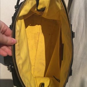 Sturdy black canvas bag with gold hardware. Open interior with bright yellow lining, great for laptop or an overnight carry-on bag. Has both an adjustable shoulder strap and leather handles. This was a gift that I didn't use very much so it's structurally sound but it is not super clean (see pics - yellow lining shows use, noticeable cleaning needed on lower outer corner). Authentic and includes leather tag with logo. Dimensions approx 15in x 9in x 5in