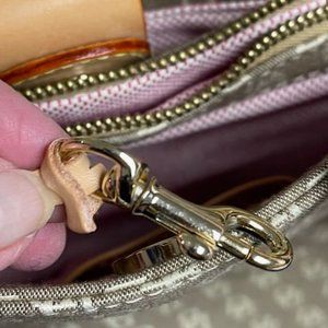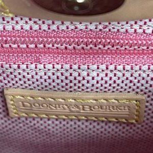 Never used! Gorgeous Dooney & Bourke cloth signature handbag/purse with vachetta leather straps. Light brown/tan. Shoulder bag with feet on the bottom. Measures 13" W, 10" H, 4.5" deep. Strap length 8.5" from top of purse to top of strap. Inside 3 sections. Middle section zippered, plus zipper on back inside pocket. Snap closure. There is a cell phone pocket inside, but it was made for older cell phones (2.5 W x 3.5 H x 1" D). Key fob. Large dust bag included. There is a very small stain on the back near bottom. See pic. (NWOT)