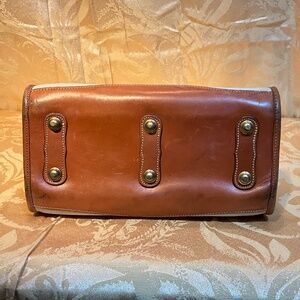 Dooney & Bourke cream and natural colored leather satchel. The hardware is golden tone. The bag’s closure is a zipper. There are “hooks” available to attach a strap if you like, however, strap doesn’t come with the bag.
