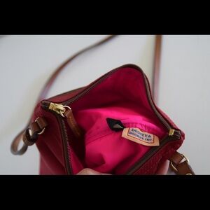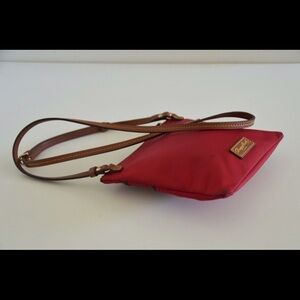Dooney & Bourke triple zip nylon cross body bag. # J1518412. Measures 8" x 8" shoulder drop 24". Adjustable long strap for cross body or shoulder wear. Zip closure. Exterior two Zip pockets. Nylon. Leather trim. Red color.