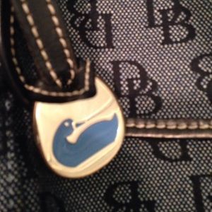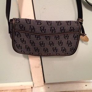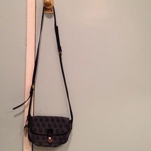 Navy blue D&B purse with a pocket in the back and a button in the front for closing. Accompanied by two buckle in the strap for length adjustments. Good condition