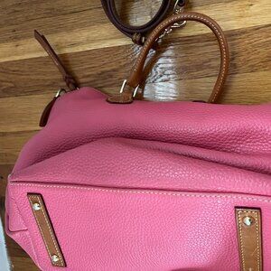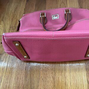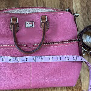 Dooney & Bourke style, this pebbled leather satchel goes from workdays to weekends seamlessly. Two outside pockets provide the perfect place to stash phone and keys, a two piece detachable strap provides additional carry options and a top zip closure.