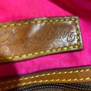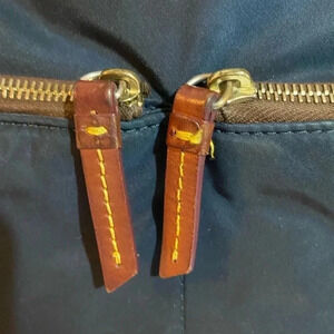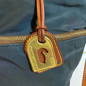 Dooney Bourke navy blue nylon satchel handbag with brown leather strap & trim with gold tone hardware main compartment 4 pockets at interior wall 1 zip closure & zip closure at top 2 zip pockets at front protective metal foot base hangtag at front minor mark hight 12” width 16” depth 5” strap drop 7” shoulder strap 27” adjustable The dimensions are based on approximately measurements before placing an order please check take a moment to view all photos using feature for a closer look