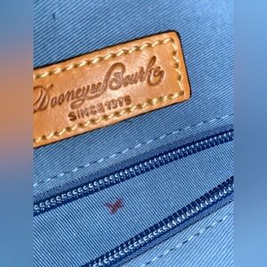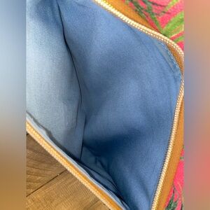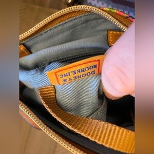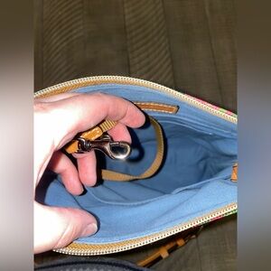 Has an adjustable strap and an attached key clip on the inside. Has a small mark on the inside (see photo) other than that it is in great condition, the inside is very clean.