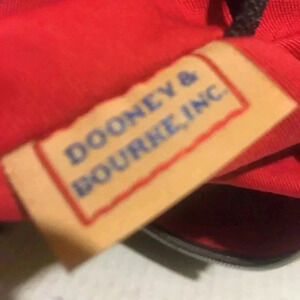Authentic dooney & Bourke Nylon print satchel handbag with brown leather strap & trim with gold tone Strap have some discoloration hardware main compartment 3 pockets at interior wall 1 zip closure & zip closure at top logo & hangtag at front red cotton fabric lining key hook minor crease please check all photos hight 9” width 11” depth 7” strap drop 5” logo print coated logo