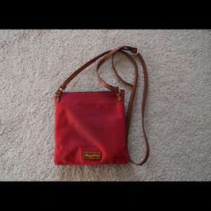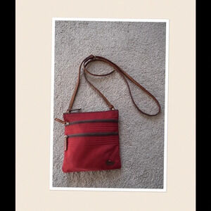 Dooney & Bourke triple zip nylon cross body bag. # J0884314. Measures 8" x 8" shoulder drop 24". Adjustable long strap for cross body or shoulder wear. Zip closure. Exterior two Zip pockets. Nylon. Leather trim. Red color.