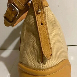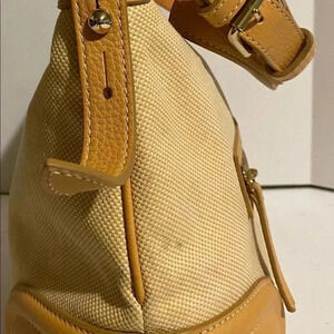 Authentic dooney & Bourke beige canvas/ leather handbag with silver tone hardware main compartment 4 pockets at interior wall 1 zip closure 1 snap & 2 open zip pocket closure at back red fabric lining leather strap & trim logo at front protective metal foot base minor marks & creasing please check all photos comes with wristlet & key hook Bag dimensions are based on approximate measurements. Before placing an order please take a moment to view all photos using zoom feature for a closer look