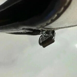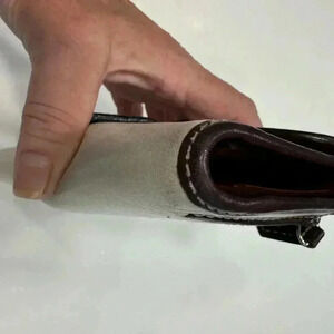 The wallet is an off white color. There is a spot of color transfer under the front flap and a pen mark inside the flap. The leather is in great condition no corner wear or tear. Inside very clean. It has a snap closure.