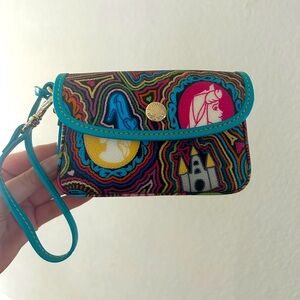 Add some Disney magic to your day with this vibrant and rare wristlet from the Disney Parks x Dooney & Bourke collection! Made with pebbled leather, this wristlet features colorful princess silhouettes, castle motifs, and whimsical accents throughout. Trimmed in turquoise leather with a bright red interior and gold-tone hardware.