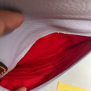 Magnetic foldover crossbody in pebble grain leather. One inside zip pocket. One slip back pocket. Six credit card slots.