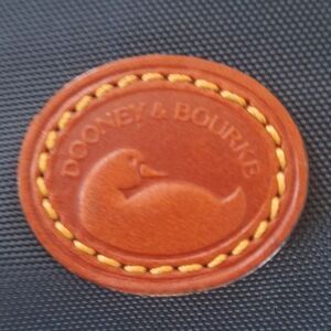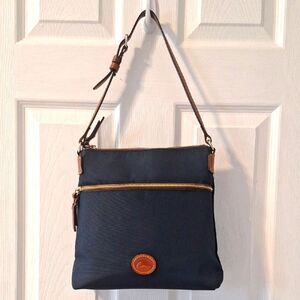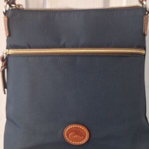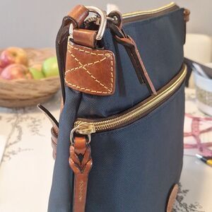 Navy blue nylon shoulder bag with brown leather trim. Outside zip pocket, Zip closure . Interior has zip pocket, 3 slip pockets and key chain. In excellent, clean condition, no real signs of wear. 9.5 X 10" X 3" with a 9 " drop