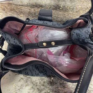 This Dooney & Bourke Signature Logo Lock Satchel in black and navy is a stunning designer purse featuring the iconic monogrammed pattern. Crafted from high-quality materials, this satchel offers both style and functionality with a spacious interior, a secure lock closure, and sturdy handles for easy carrying. Please note, this purse is in beautiful condition with the exception of a couple of minor pen marks on the interior; please refer to the pictures for details. A timeless piece that adds sophistication and elegance to any outfit!