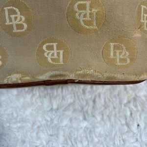 Dooney & Bourke canvas logo khaki bucket shoulder bag with leather brown trims