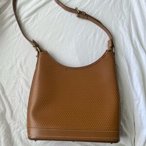 Gorgeous pristine Dooney & Bourke bucket satchel bag with adjustable strap. Real leather with perforated mesh detail. In gorgeous caramel tan brown color.