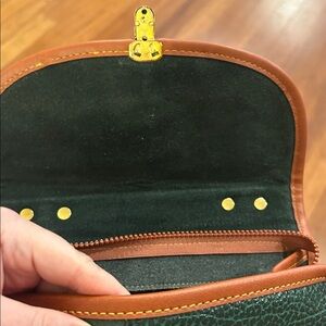 Very very well taken care of. Slight stain on the very bottom. Stylish green and brown leather handbag with gold-tone hardware.