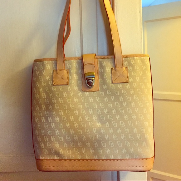 Cream and tan shoulder bag with clip and attached makeup bag.