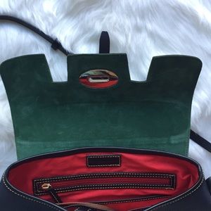 Hello there, and thank you for viewing my listing! I'm selling a Navy and Brown Gently Used, in Good Condition Dooney & Burke Handbag/ Shoulder Bag. There are a few light scratches on the brown back part of the bag( picture included). The bag has a green interior flap and a red interior. Message me with any questions! :)