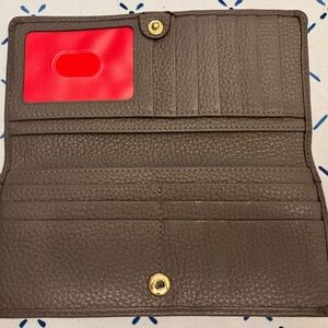 Grey with tan trim full size pebble leather wallet with red interior. Can fit a checkbook. Very lightly used, may have some light scuffs. 7.5”x 3”