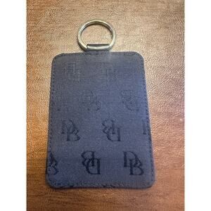 Dooney & Bourke ID or card holder keychain. It features the brand's signature "DB" logo monogram pattern in black canvas with leather trim accents and a gold-tone key ring.
