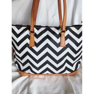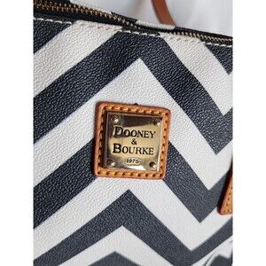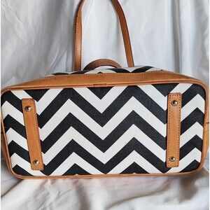 Dooney and Bourke Black & White Chevron Stripe Maxine Tote Large With Tan Straps