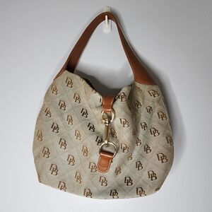 Dooney and Bourke Brown Nylon Hobo Handbag with Leather Strap And Hook Clasp