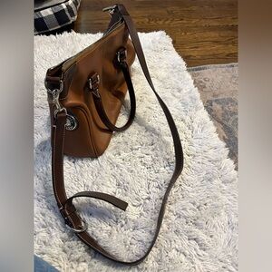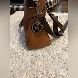 Dooney and Bourke, Brown Pebbled Leather with Brown Handles, Hand/Shoulder bag. This bag is in excellent condition, refer to photos. This purse can be used as a handbag or shoulder/crossbody bag with the removable, long and adjustable brown leather strap. This leather is so soft and the stitching is a beautiful cream color against the brown. There is some wear on the inside but overall this is a great classic purse.