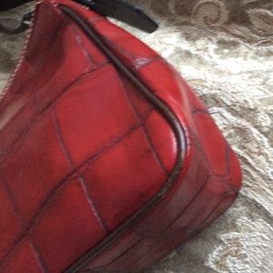 This crimson color genuine leather small hobo is beautiful. It has a zipper closure. It has an interior zipper compartment and small phone or slip pocket. It has the tradition fob for attaching keys. The single equestrian styled shoulder strap sets this bag apart. The lining is in good shape and there’s some minor wear on the piping shown in the pictures. Price is firm. The bag will be videotaped prior to shipment to confirm it’s condition.