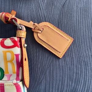 Multicolor Dooney & Bourke Leather Crossbody purse. I believe this is "Graphica" 40434. It has 2 adjustable buckles to get the perfect hang that is comfortable for you. Features an outside zippered pocket and two inside zippered pockets. The blue lining has no tears or stains.The purse measurements are 8.5 high x 9.5 wide x 2" deep and an adjustable hang. Very good condition + D & B quality + a fun pop of color to any outfit!