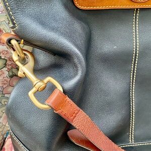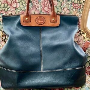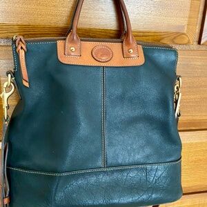 Beautiful Dooney and Bourke Florentine Bag in the color black. This is a large bag and can carry all your essentials. Leather is amazing. Inside is very clean Bottom studs to protect the bag. Short handle and longer shoulder strap. Typical setup inside the bag with a large zippered pocket and several slip pockets. Haven't seen this style before which is why I purchased it but just not using anymore. Bag measures 14 inches in width, 13 inches in height and has a depth of 6 inches. No smells. Comes from a pet free and smoke free home. Reasonable offers will be considered.