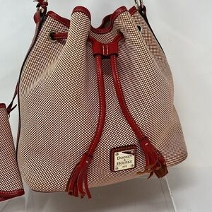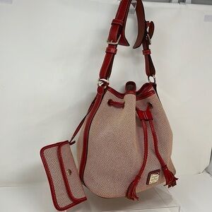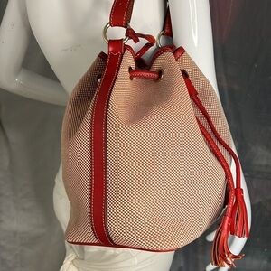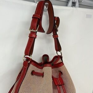 Dooney and Bourke Red Beige Canvas Leather Drawstring Shoulder Bucket Bag