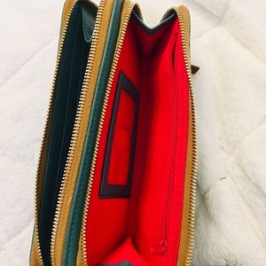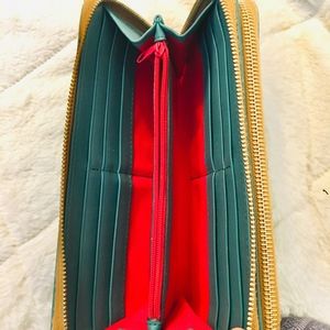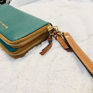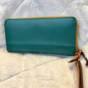 Roomy Dooney and Bourke wristlet wallet that can fit all your cards, phone and small items. 12 card slots,1 transparent ID slot, 2 interior zip pocket and 2 exterior zipper pockets. It's a beautiful teal color with gold accents and a pop of red on the inside.There are some hardly visible minor scratches on the back that were hard to capture on camera.Feel free to comment with any questions!