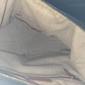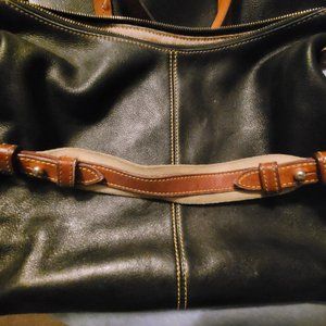 Beautiful black and tan purse. Leather bag with cotton strap and metal buckles. Very little wear. Checkered lining.