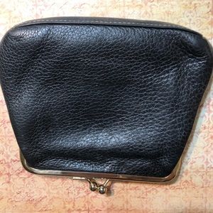 EUC coin purse. Soft pebble leather with no defects. Brass clasp shows some signs of wear. Red lining with six card slots. 5 in x 6 in