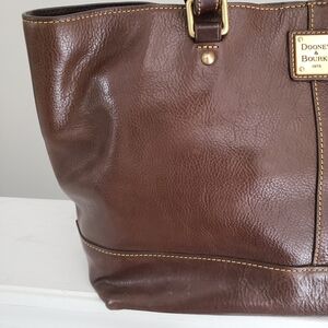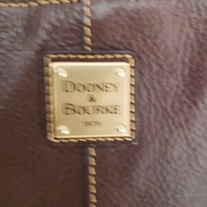 Florentine leather body, main entry magnetic snap closure, double handles, leather patch logo, four feet