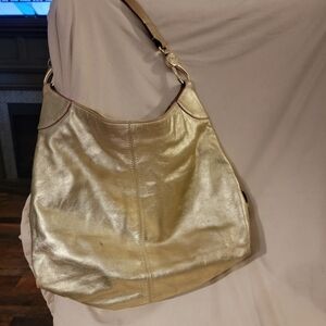 Dooney and Bourke purse in gold. Beautiful hardware. Gently used. As seen in the picture, there is a small area of natural leather wear on the purse.