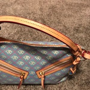 Quilt print, light blue, red and off white Dooney and Bourke shoulder bag with matching wallet. Leather is in great condition!! Slightly worn and free of stains and soil