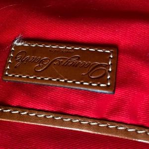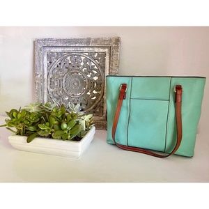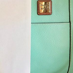 Teal/aqua real Dooney & Bourke tote. Originally purchased for $298. Red interior, never used. Feels like new, has just been sitting in my closet. Great spring/summer color. One photo shows bag next to white computer paper to show color more accurately. Photos also show interior label and registration code for proof of authenticity.