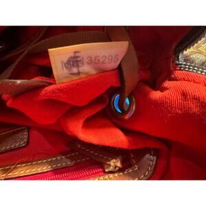 Dooney and Bourke Wayfarer tote in turquoise canvas with tan leather straps and trim. Zipper top. Red cloth interior. 2 interior slip pockets with snap top and one interior zip pocket